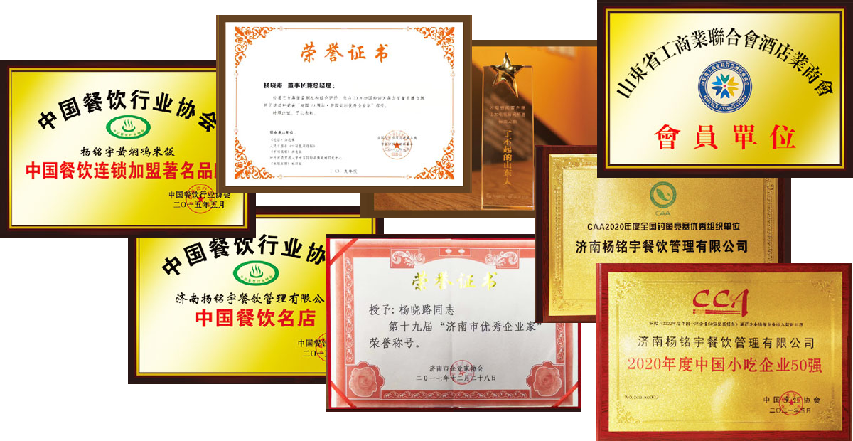 濟南楊銘宇餐飲管理有限公司由楊曉路先生創(chuàng)辦于2011年,是中國自主品牌領(lǐng)軍企業(yè)、建國70周年·推動中國經(jīng)濟發(fā)展百強企業(yè)、中國質(zhì)量守信示范企業(yè)、全國創(chuàng)建餐飲服務(wù)食品安全示范單位。“楊銘宇”作為中國黃燜雞品類的創(chuàng)始品牌,憑借厚重溫潤的魯菜文化底蘊和成熟的連鎖加盟機制,現(xiàn)已發(fā)展成為中國小吃行業(yè)的領(lǐng)導品牌?!爸腥A風味名吃”、“中國餐飲連鎖加盟著名品牌”、“中國餐飲名店”、中國餐飲創(chuàng)新力TOP100榜“管理創(chuàng)新獎”、“中國餐飲影響力品牌50強”、“2020年度中國小吃企業(yè)50強”、“中國餐飲門店規(guī)模第一品牌”。